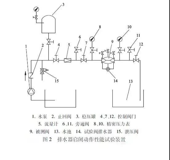 在文獻[1]~[5]中,對倒流防止器的使用性能、制造安裝和試驗檢測給出了明確的規定和要求,其中對于倒流防止器的設置要求和阻力性能試驗及性能指標有所差異。倒流防止器的使用和性能試驗項目及方法主要包括排水器啟閉動作性能試驗,排水器密封性能試驗,回流污染功能試驗,耐久性能試驗,壓力損失試驗,殼體強度試驗和閥瓣的強度試驗。3.1 排水器啟閉動作性能試驗排水器啟閉動作性能試驗裝置(圖2)壓力小于0 3 MPa。被測閥的進口壓力降低,在不大于出口壓力時,排水器應開啟排水,但不持續排水。在被測閥通水時,排水器應迅速關閉,不漏水。連續重復上述步驟3次以上,排水器啟閉動作應靈敏可靠。